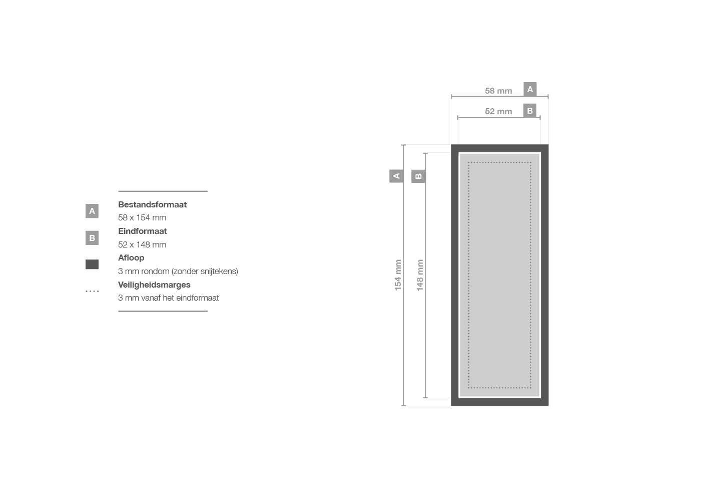 Het meest bestelde formaat boekenlegger is de A7 lang, deze heeft het formaat van 5,2 x 14,8 cm. Ook de onsterstaande formaten zijn makkelijk bij Drukland.be te bestellen. Zelfs het kiezen voor een eigen eindformaat is mogelijk.