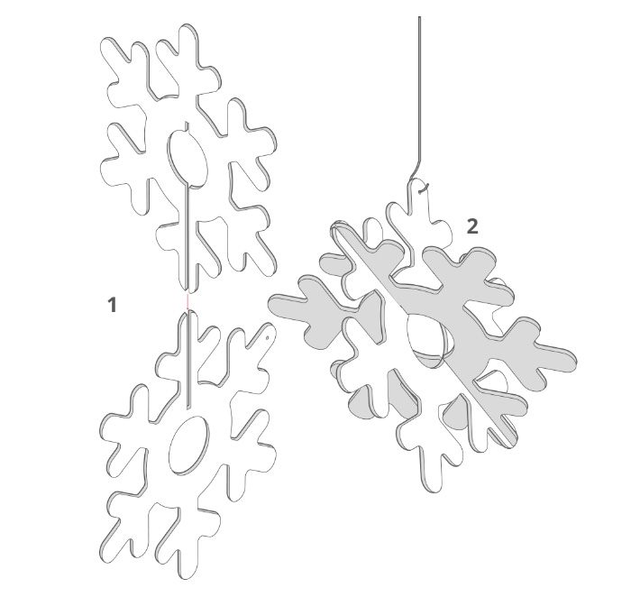 De sneeuwvlokken van Drukland.be bestaan uit 2 onderdelen die makkelijk in elkaar te schuiven zijn. Optioneel zijn dubbelhaken en systeemplafondclips bij te bestellen. Deze kerstdecoratie is standaard voorzien van een boorgat.